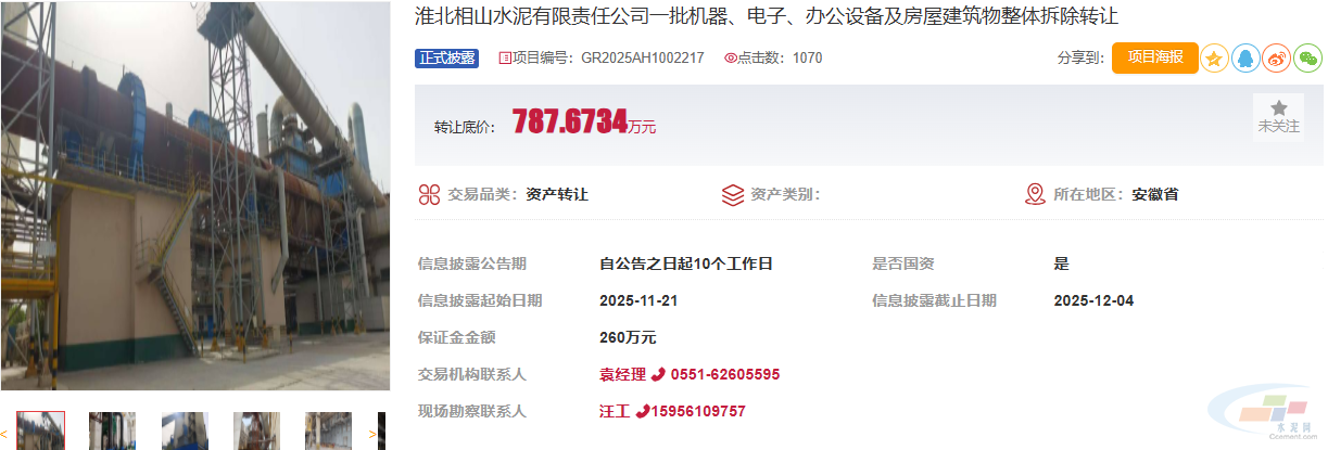 近日,据相关资产交易平台信息显示,淮北相山水泥有限责任公司一批机器、电子、办公设备及房屋建筑物整体拆除转让,转让底价787.6734万元。